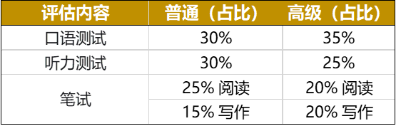 爱尔兰高中的中文课程分为普通(OrdinaryLevel)和高级(HigherLevel)两个级别。考试形式分口语测试和笔试(包括听力测试)两部分。各部分所占比重如下图。每个部分都由国家考试委员会(SEC)管理和评估。普通级别听说读写各部分占比为:口语30%,听力30%,阅读25%,写作15%。高级别听说读写各部分占比为:口语35%,听力25%,阅读20%,写作20%。