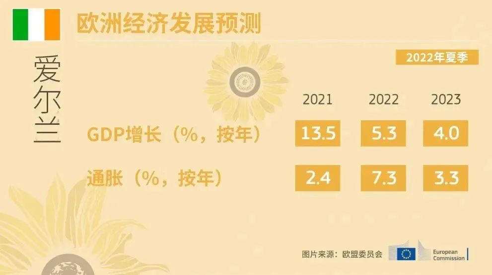 继2022年上半年出色的表现之后,爱尔兰经济前景依旧强劲。欧盟委员会对爱尔兰2022年实际GDP增长的预期为5.3%,而对2023年的年度增长预期则为4.0%。