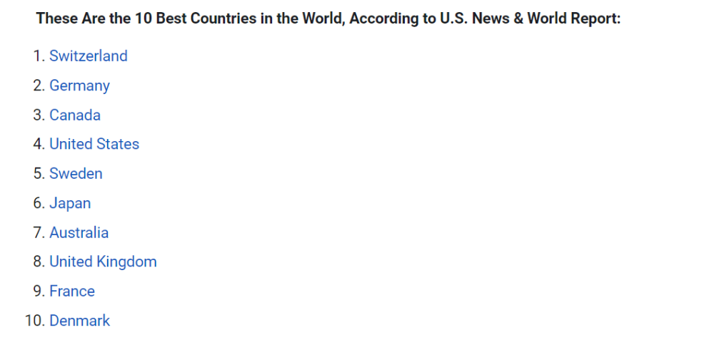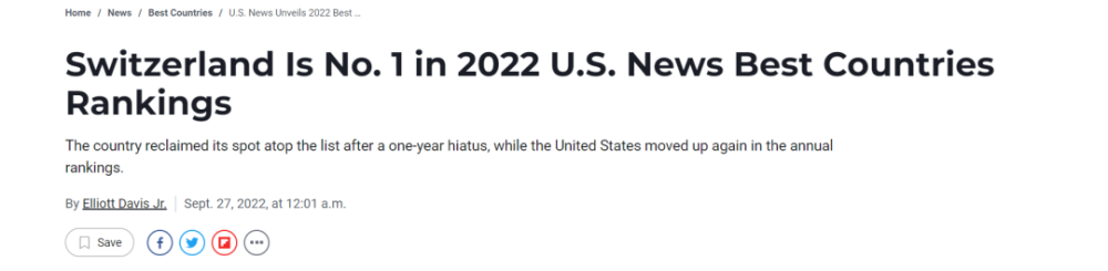 9月27日《美国新闻与世界报道》( US News & World Report)发布了“2022 年度全球最佳国家榜单”!