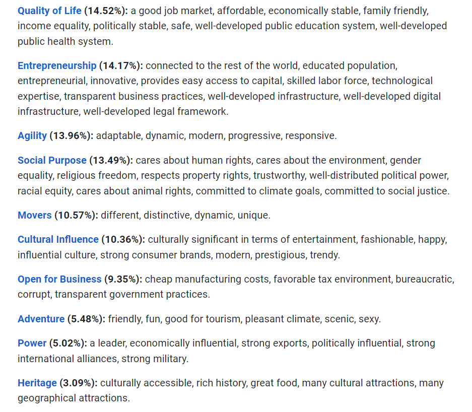 此外,还包括Cultural Influence 文化影响力 (10.36%)、Open for Business 商业友好度 (9.35%)、Power 国家实力 (5.02%)、Adventure 投机机会 (5.48%)、Heritage 传统传承 (3.09%)。
