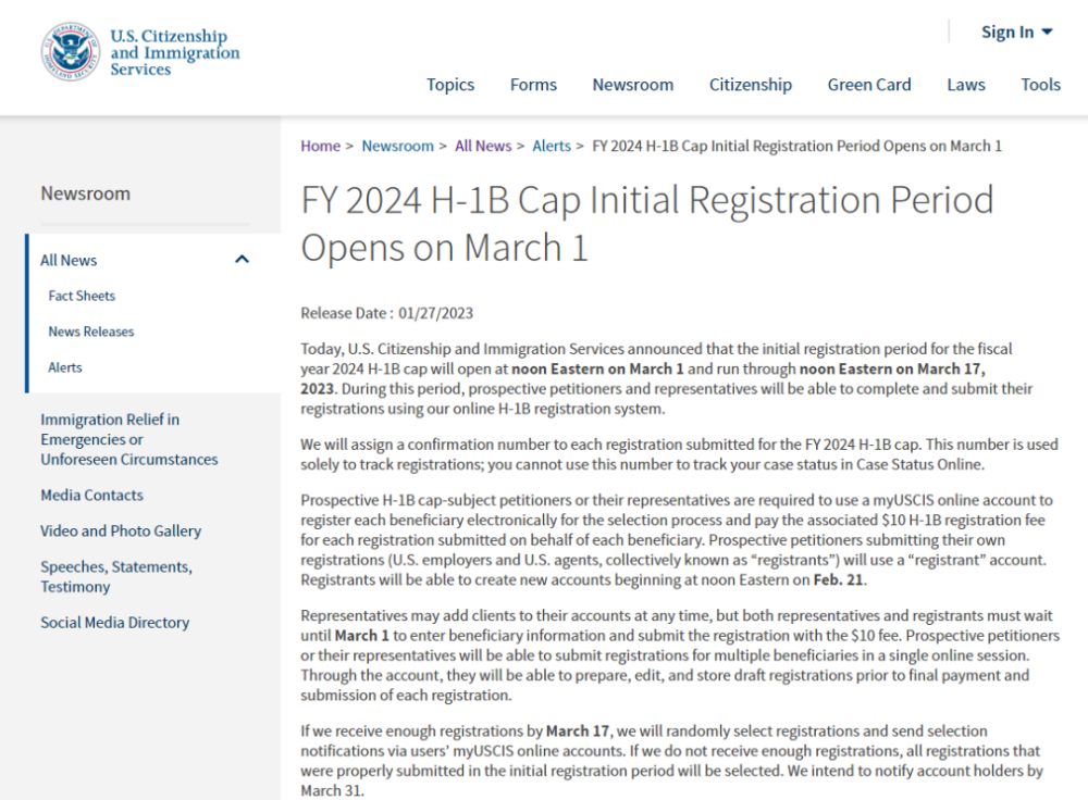 美国移民局近日公布了2024财年H-1B抽签注册的起始时间: