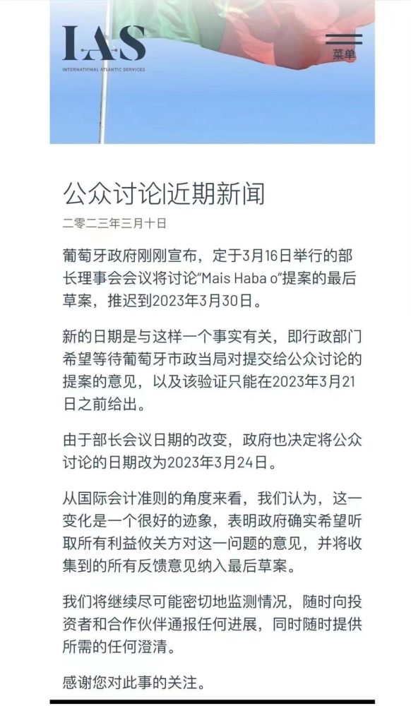 最新消息,应葡萄牙全国市政府协会要求,为了给大家更多时间作为过渡期,或者更从容地抓住最后的机会递交办理,葡萄牙政府对法案草案的民众咨询延长到3月24日,然后3月30日议会投票决定。