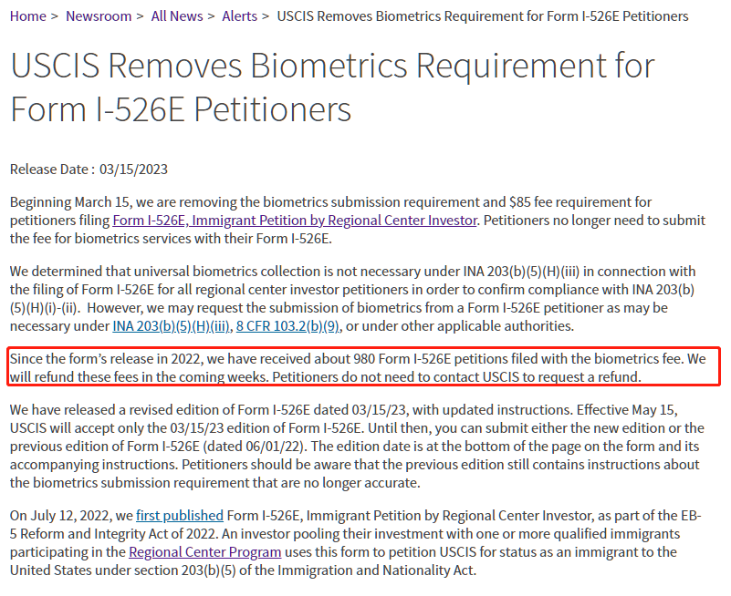 3月15日,美国移民局官网发布了一则消息:取消递交I-526E(即区域中心投资移民申请)申请人的生物识别(Biometrics)要求以及85美元的费用要求。申请人无需再随I-526E申请表递交生物识别服务费。