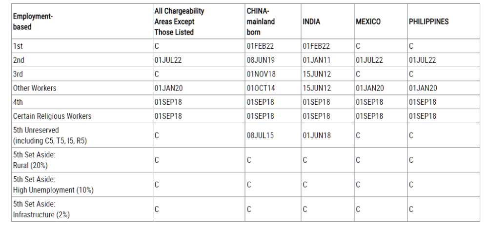 表A是指有签证名额的排期。表A排期到了,就是说有一张绿卡名额可以签发给你了。当表A日期前进到申请人的优先日期,如果投资人在美国境外,且I-526已经获批,会收到广领馆的面试安排通知;如果人在美国境内,就可以在美国递交I-485转换身份申请了。