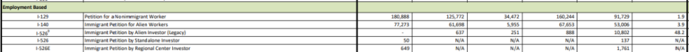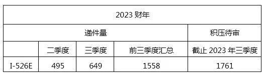 新政下的首个I-526E是2023年7月份获批的,属于财年的四季度。因此,如表格显示的,前三季度暂未有I-526E获批。I-526E积压数为1761。