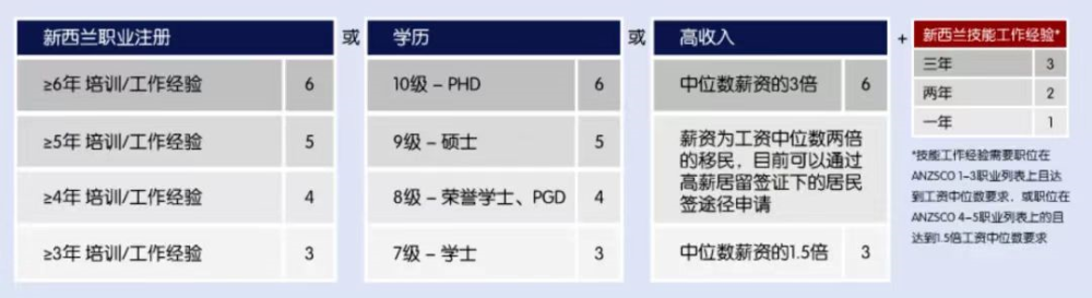 5.工作要求: 必须有一份新西兰全职工作,即一份由新西兰认可雇主提供的工作机会,薪资达到工资中位数(ANZSCO 技能级别4或5职位的申请人必须获得至少 1.5 倍的工资中位数);全职工作是指每周至少30小时,以及与雇主至少签订12个月永久合同或定期合同