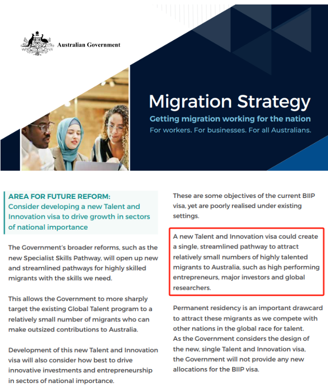 2024年11月,澳洲移民局《移民战略》明确提出:“A new Talent and Innovation visa could create a single, streamlined pathway to attract relatively small number of highly talented migrants to Australia, such as high performing entrepreneurs, major global researchers.”将有一个新的移民类别出现,合并现有GTI与BIIP(858和188),新的类别会有新的代码,配额减少,对申请人的要求提高、更加多元化。