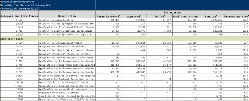 近日,美国移民局(USCIS)在其官网公布了2024财年首季度(即:2023年10月1至2023年12月31日)EB-5案件的各项统计数据。