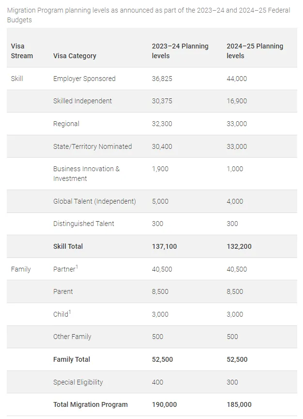 2024~2025财年,澳洲移民整体配额为185,000,比上财年减少5000个,技术移民和家庭移民的比例约为70:30。
