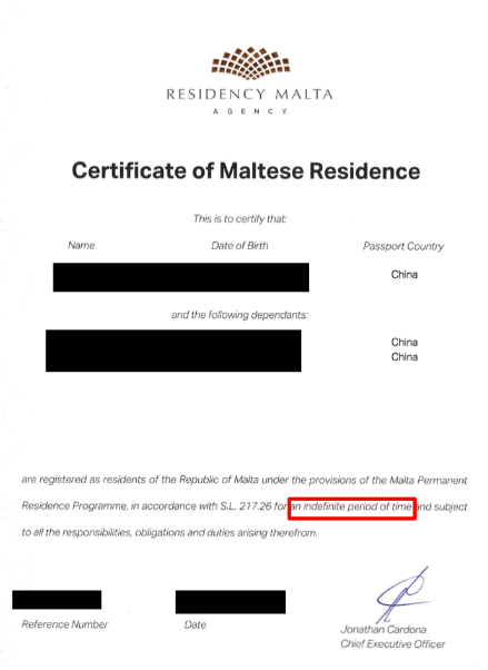 马耳他身份局颁发的身份证书,Certificate of Maltese Residence在这张证书上的字眼使用的是for an indefinite period of time即为无期限,这点充分体现了MPRP身份取得的是永久居留卡。