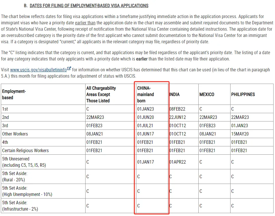 职业移民表B仅适用于在美国境内调整身份的申请人;若申请人不在美国,适用于领馆处理,适用表A。