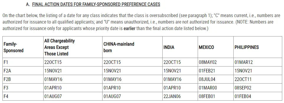 亲属移民F1(公民成年未婚子女)表B无变化;