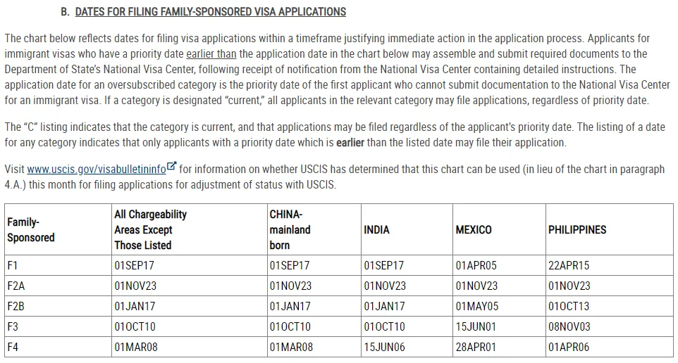 亲属移民F4(公民兄弟姐妹)表B无变化;