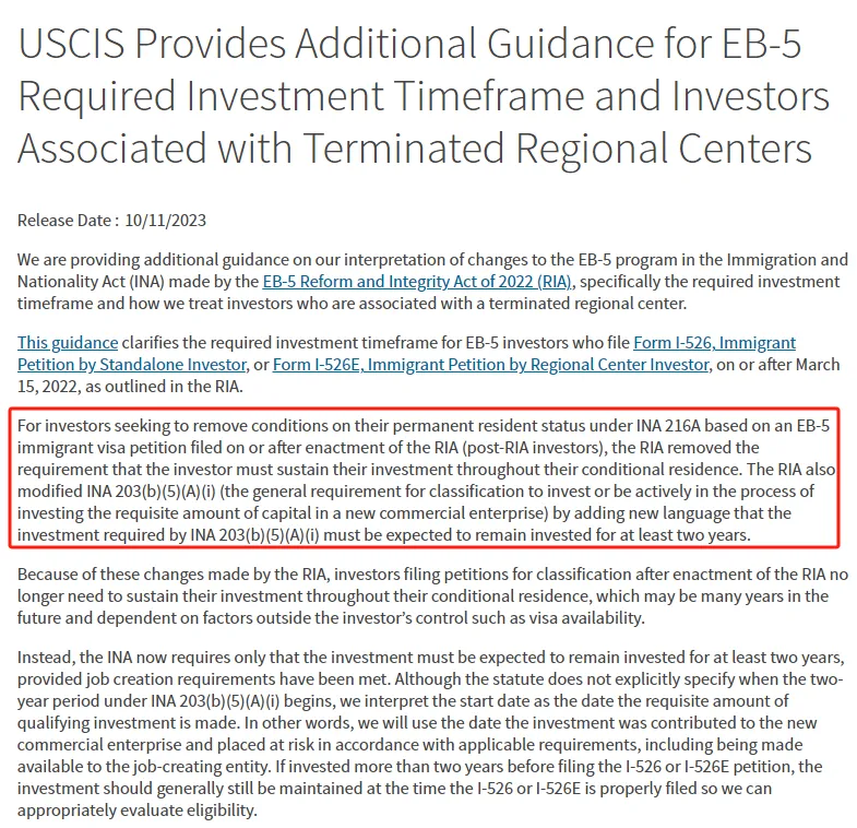 2023年10月,美国移民局针对EB5更新了一项重要条款:EB5投资移民的投资款在创造足够的就业机会情况下,投资在风险中至少维持两年。