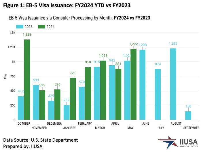 仅在今年5月份,有222份EB5签证通过领事程序发放,这是2024财年以来第二高的月度签证发放量。单月处理了1,222份未保留的EB5签证。