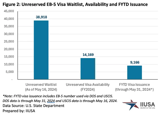 2024财年,在未保留类别下有近14,170个EB-5签证可用,签证处理在减少当前RIA前EB-5投资者的积压方面发挥了至关重要的作用。来自国务院的数据表明,2024财年,通过领事处理和身份调整使用EB55签证号码的情况有所改善。