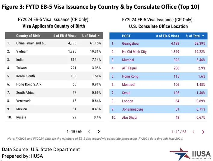 来自中国、越南、印度、中国台湾和韩国的申请人继续成为2024财年EB5签证的最大投资者群体,合计占当前财年前八个月所有EB5签证签发量的近92%。值得注意的是,超过61%的EB5签证由中国申请人获得,其中近4,200个EB5签证在美国驻中国广州领事馆处理。