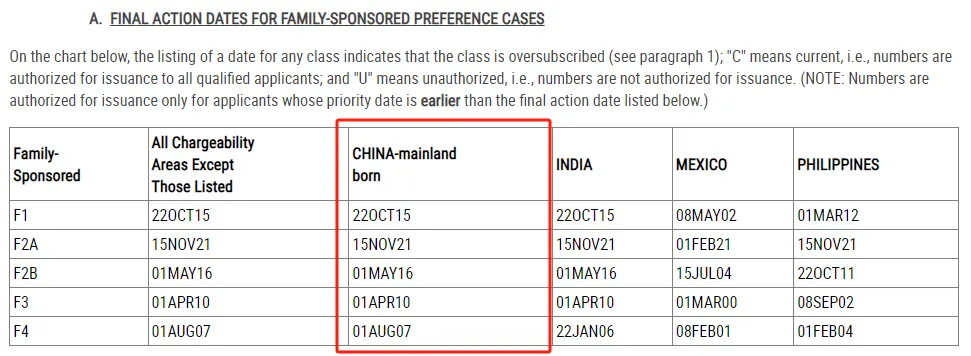 · 亲属移民F2A(绿卡持有人的配偶和未成年子女),2021年11月15日,无变化;
