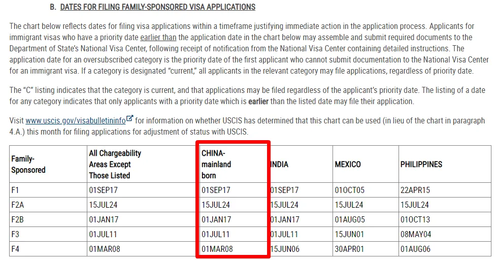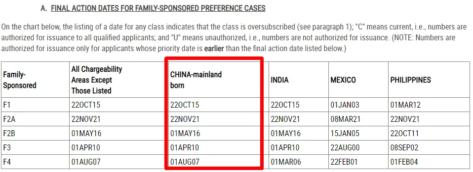 亲属移民表B:F2A小幅前进、F3大幅前进