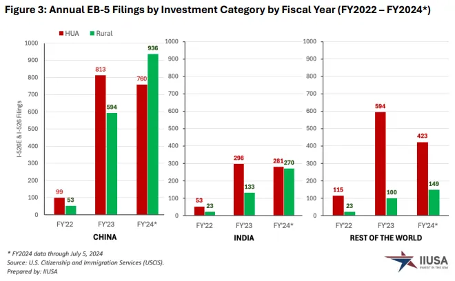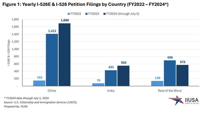 数据显示,来自中国、印度和世界其他地区的投资者对 EB-5 投资的需求显著增长,2023 财年和 2024 财年的申请数量远超 2022 财年水平。尤其是中国和印度,截至 2024 财年 7 月 5 日提交的申请数量已经超过了整个 2023 财年的总申请量。