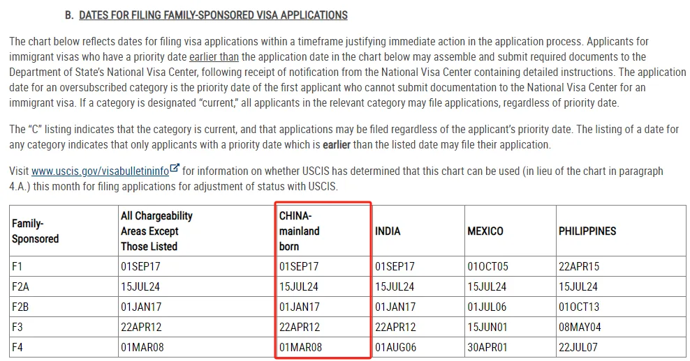 亲属移民F2A(绿卡持有人的配偶和未成年子女),2024年7月15日,无变化;