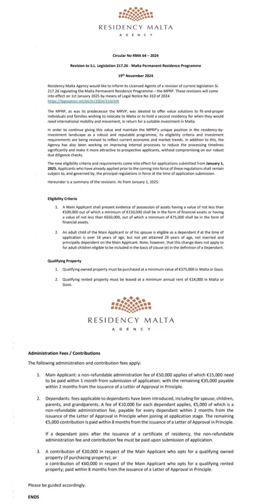 11月19日,马耳他政府突然宣布,自2025年1月1日起,调整马耳他永久居留计划(MPRP),对附属申请人标准、捐款费用、购房和租房费用等进行了调整。