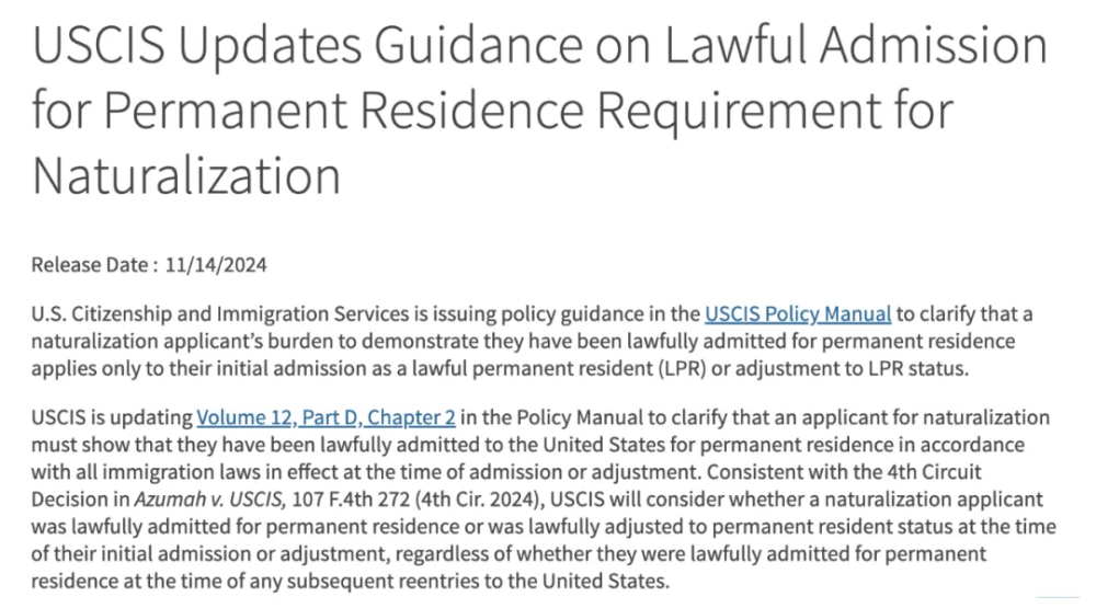 1. 审查范围缩小:USCIS 将仅审核申请人首次成为永久居民(即获得绿卡)时的合法身份。这意味着,绿卡持有者在之后的国际旅行或出入境记录,将不再成为入籍审核的重点,大大减轻了申请人的证明负担。