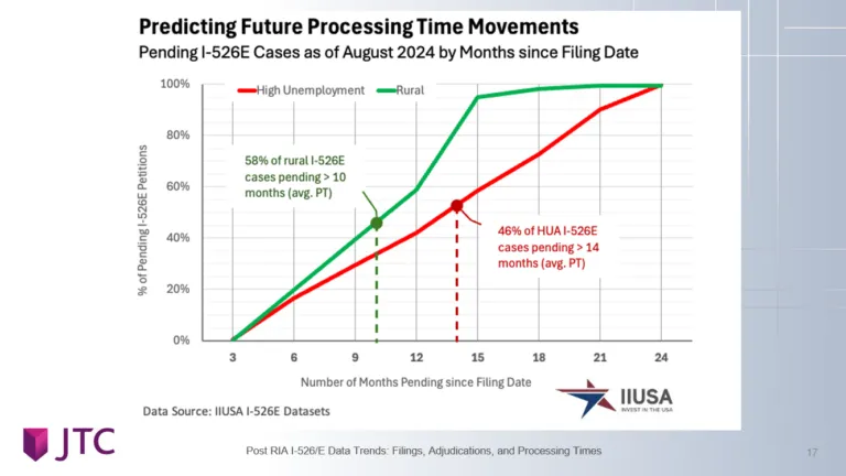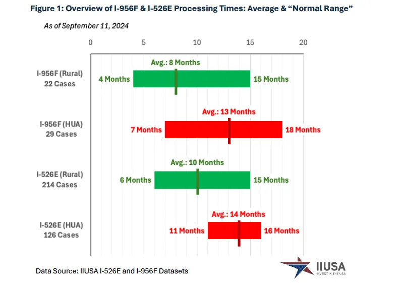 乡村项目的I-526E申请处理速度显著更快。数据显示,乡村项目的平均处理时间为10个月,而高失业率城市项目的平均处理时间为14个月。这与RIA 法案中明确表示优先处理乡村项目条款一致。