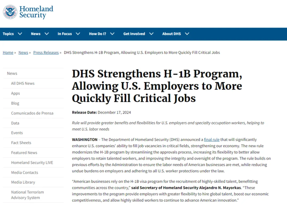12月17日,美国国土安全部(DHS)发布了一份关于H1B的规则变化文件,主要是为了完善H1B的规则和增加H1B效率。新规将经历30天公示期,于2025年1月27日生效。