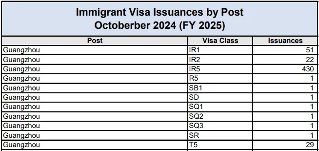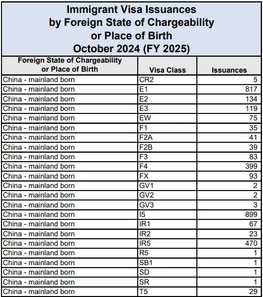 美国国务院发布了2025财年第一个月(2024年10月)各类移民签证发放的数据情况。