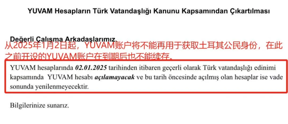 自2025年1月2日起,土耳其或将停止开设Yuvam存款保本移民账户,而已开设的此类账户在到期后也将不再享受保本政策。