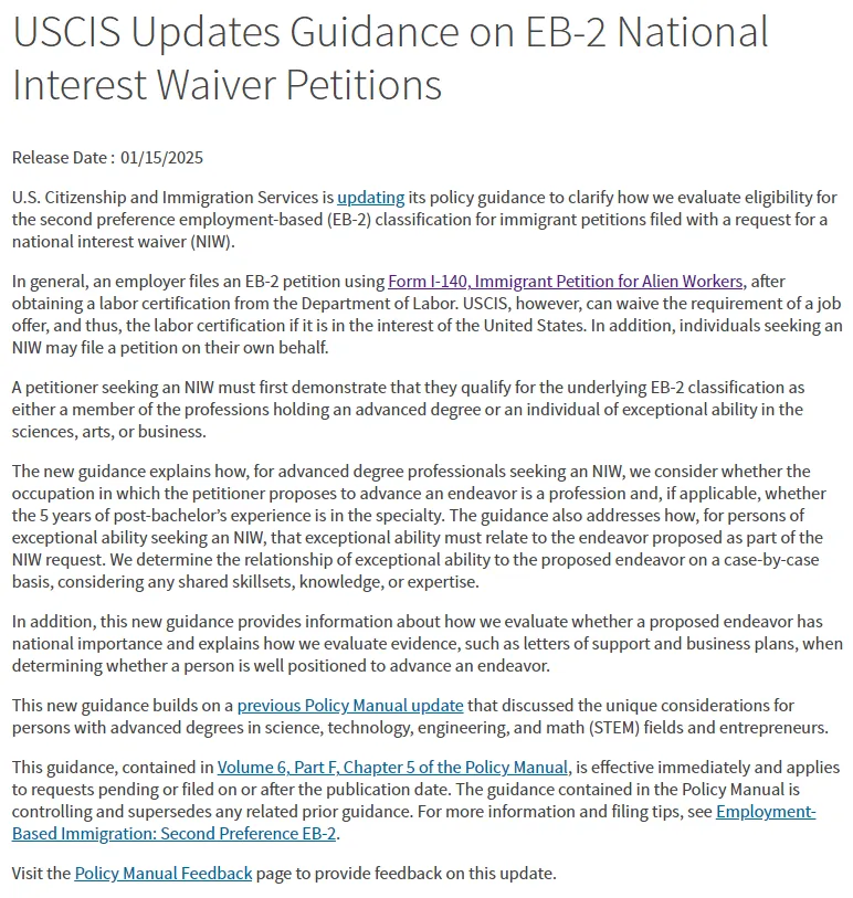 2025年1月15日,美国移民局更新了NIW的申请指南。