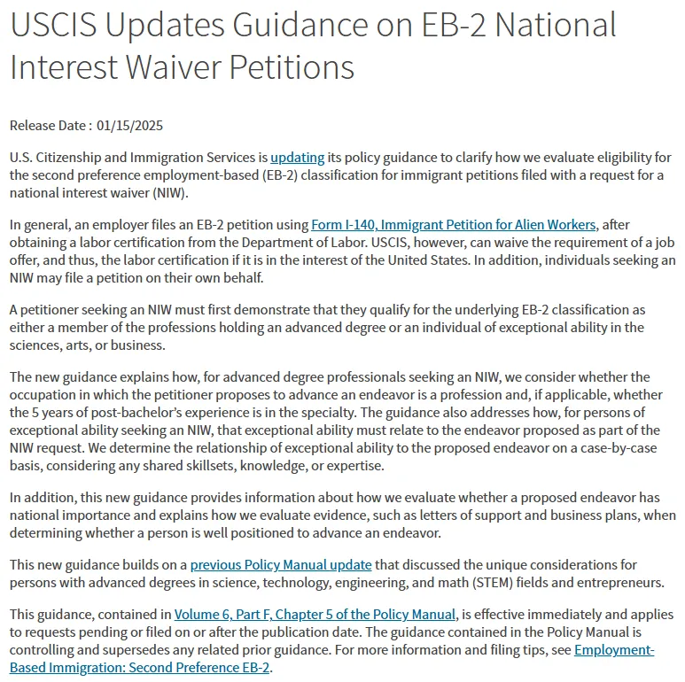 今年1月,美国移民局更新了NIW的申请指南,对申请资格和审查标准进行了进一步明确。