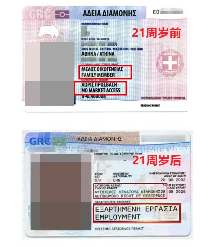 在21~24周岁之间,续签的居留卡类别从家庭附属身份转变为“AUTONOMOUS RIGHT OF RESIDENCE”,即独立居留权,备注为 “EMPLOYMENT”,意味着子女可以在希腊合法工作。