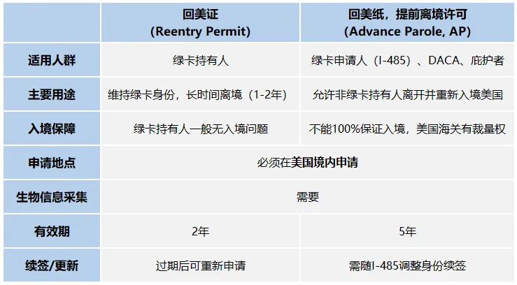 回美纸也叫提前离境许可AP,是一种旅行文件。适用于I-485 正在进行身份调整的申请人,持回美纸离境后可顺利返回美国,不影响绿卡审批进程。