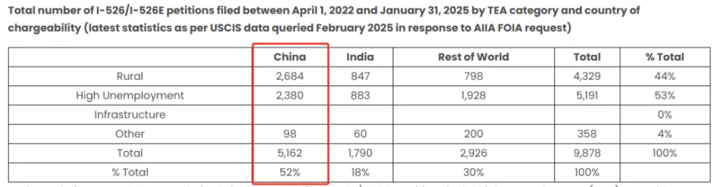 AIIA的总结,从截至2025年1月的I-526/I-526E的相关数据来看