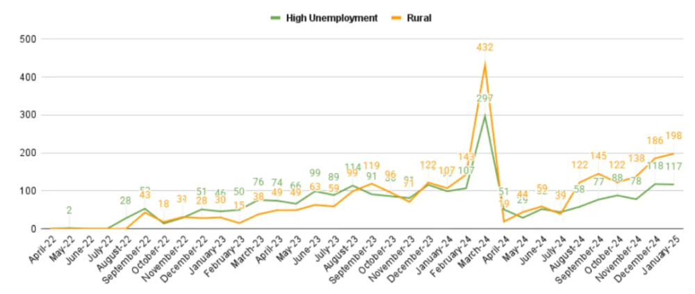 乡村地区项目比高失业地区投资项目更受欢迎,申请量持续领先。
