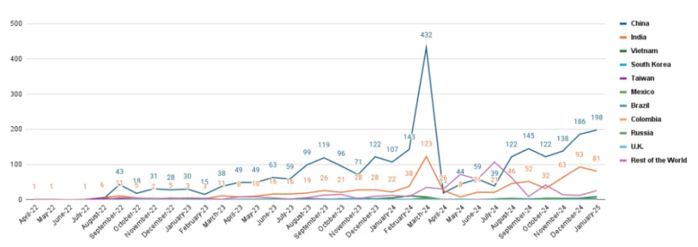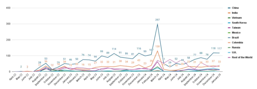尤其值得注意的是,中国和印度申请人的活跃程度在近几个月逐步趋于平稳,反映出市场正在适应新政策和成本变化后的调整期。