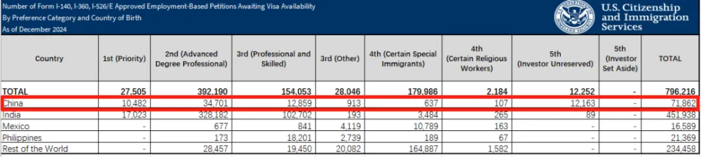 这条规则对申请人数众多的国家,尤其是中国、印度的影响极大,因为即便有足够的合格申请人,也会因为这条“每国限额”而导致排期拉长和积压。