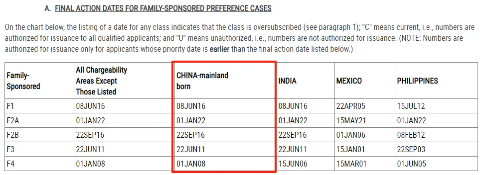 三、6月美国亲属移民排期(表A)