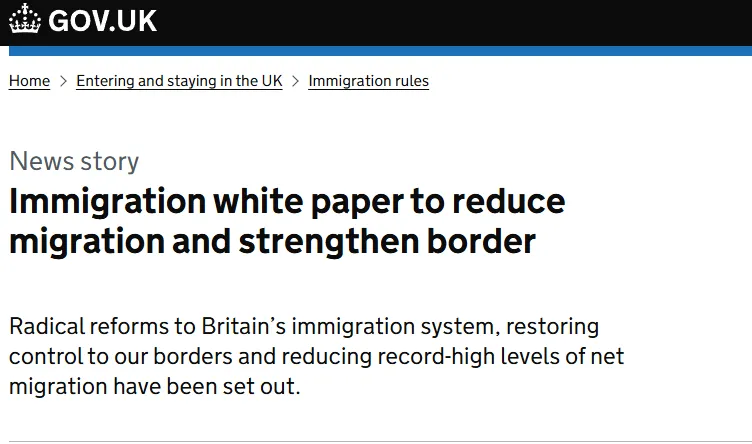 2025年5月12日,英国政府发布了长达82页主题为的《恢复对移民体系的控制》的移民白皮书,提出一系列重大改革措施,旨在减少净移民人数、加强边境管理,并重塑现行的移民制度。