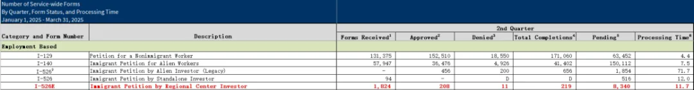 美国移民局在6月30日更新了2025财年第二季度(1~3月)各类移民的数据,其中EB-5新政的I-526E申请大涨。