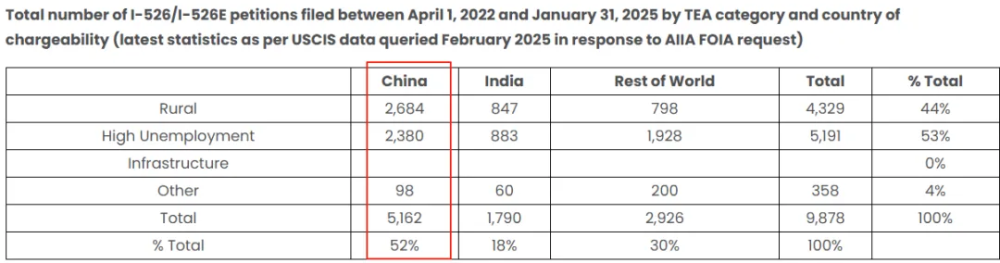 而根据AIIA统计,截至2025年1月,中国大陆在EB-5新政预留类别下的递交量已达5,162份,远超年配额上限。