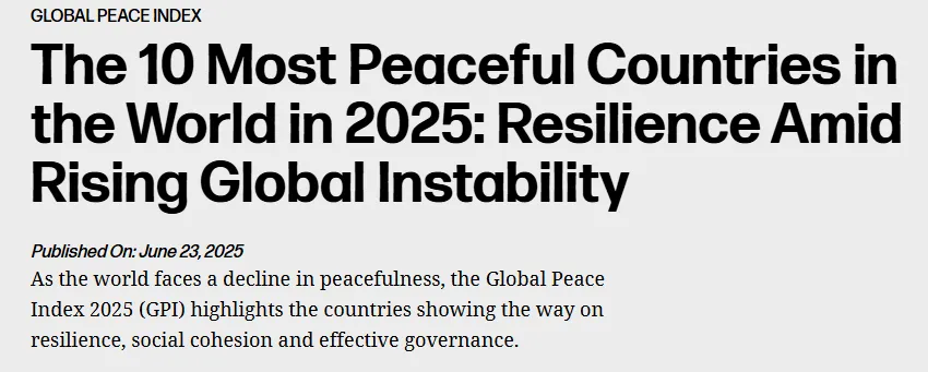 Vision of Humanity最近公布了2025年全球平和指数。以社会安全度、国内外冲突、军事化程度来评分。