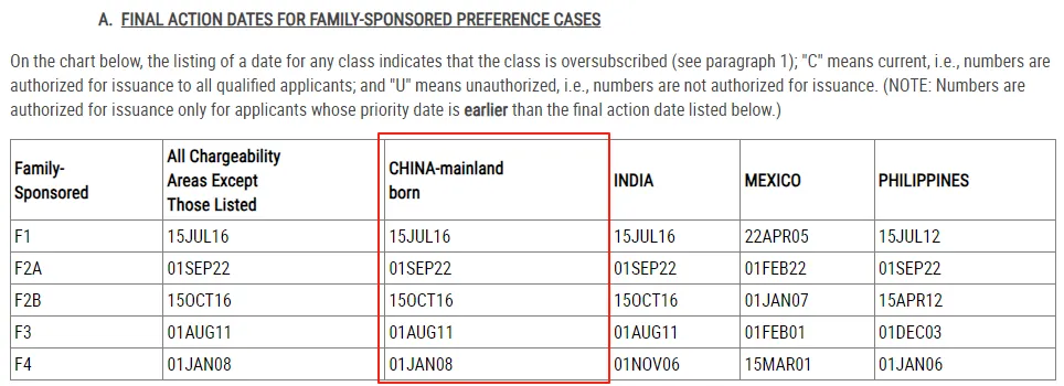 三、8月美国亲属移民排期(表A)
