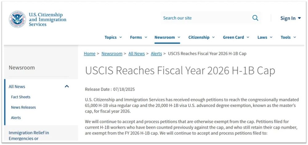 7月18日,美国移民局(USCIS)正式宣布:截至2024年6月30日,2026财年所有基于抽签中签的H-1B申请名额已被用尽。这意味着,今年将不再进行第二轮H-1B抽签。