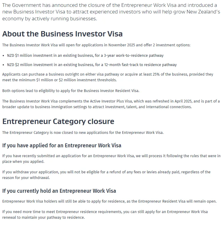 8月27日,新西兰移民局宣布关闭企业家工作签证,并将推出新的商业投资者签证(Business Investor Visa, BIV),预计今年11月开放申请。