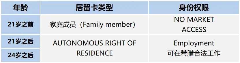 在21~24周岁之间,续签的居留卡类别从家庭附属身份转变为“AUTONOMOUS RIGHT OF RESIDENCE”,即独立居留权,备注为 “EMPLOYMENT”,意味着子女可以在希腊合法工作。