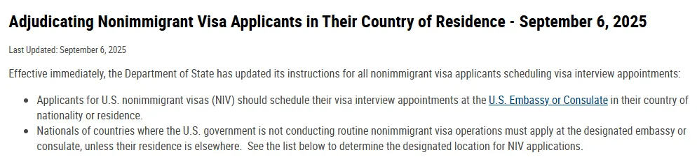 2025年9月6日,美国国务院发布了最新政策,从即日起, 所有非移民签证申请者必须在其国籍所在国或合法居住国的美国大使馆或领事馆进行面试。