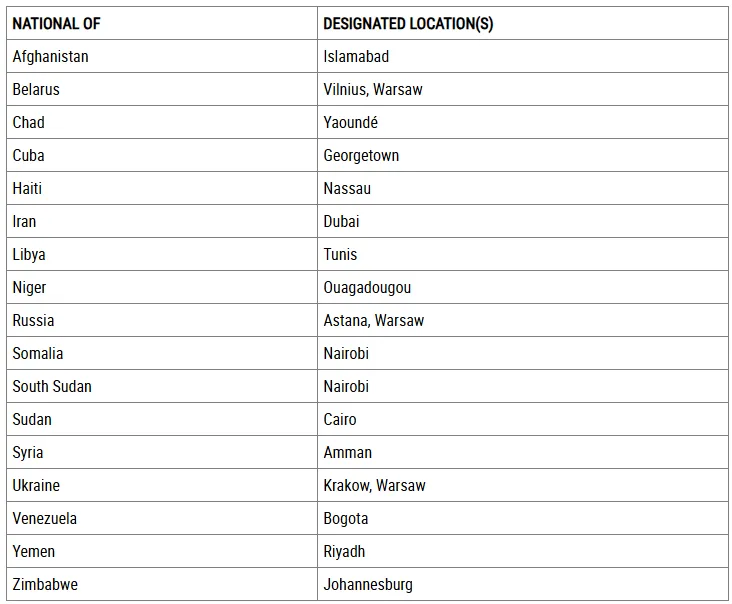 对于某些没有美国领事馆、或不提供常规签证服务的国家,美国国务院指定了替代地点: